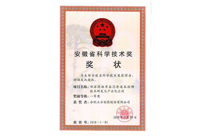 合肥立方制藥股份有限公司科學技術一等獎