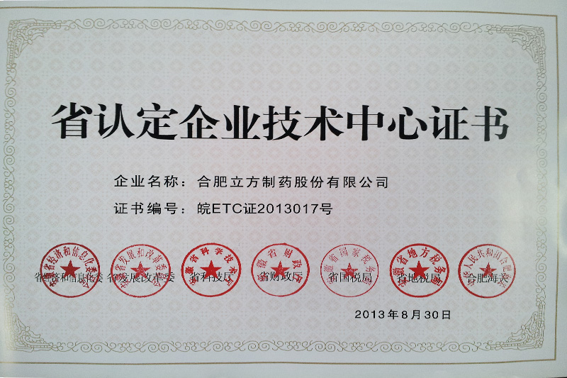 立方制藥 省認定企業(yè)技術中心 證書